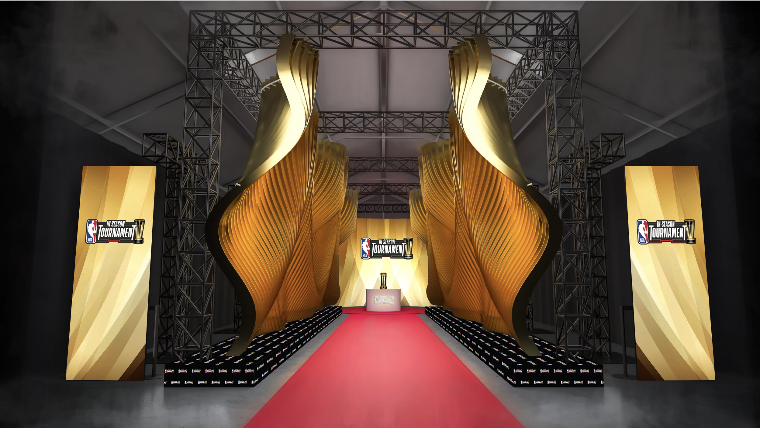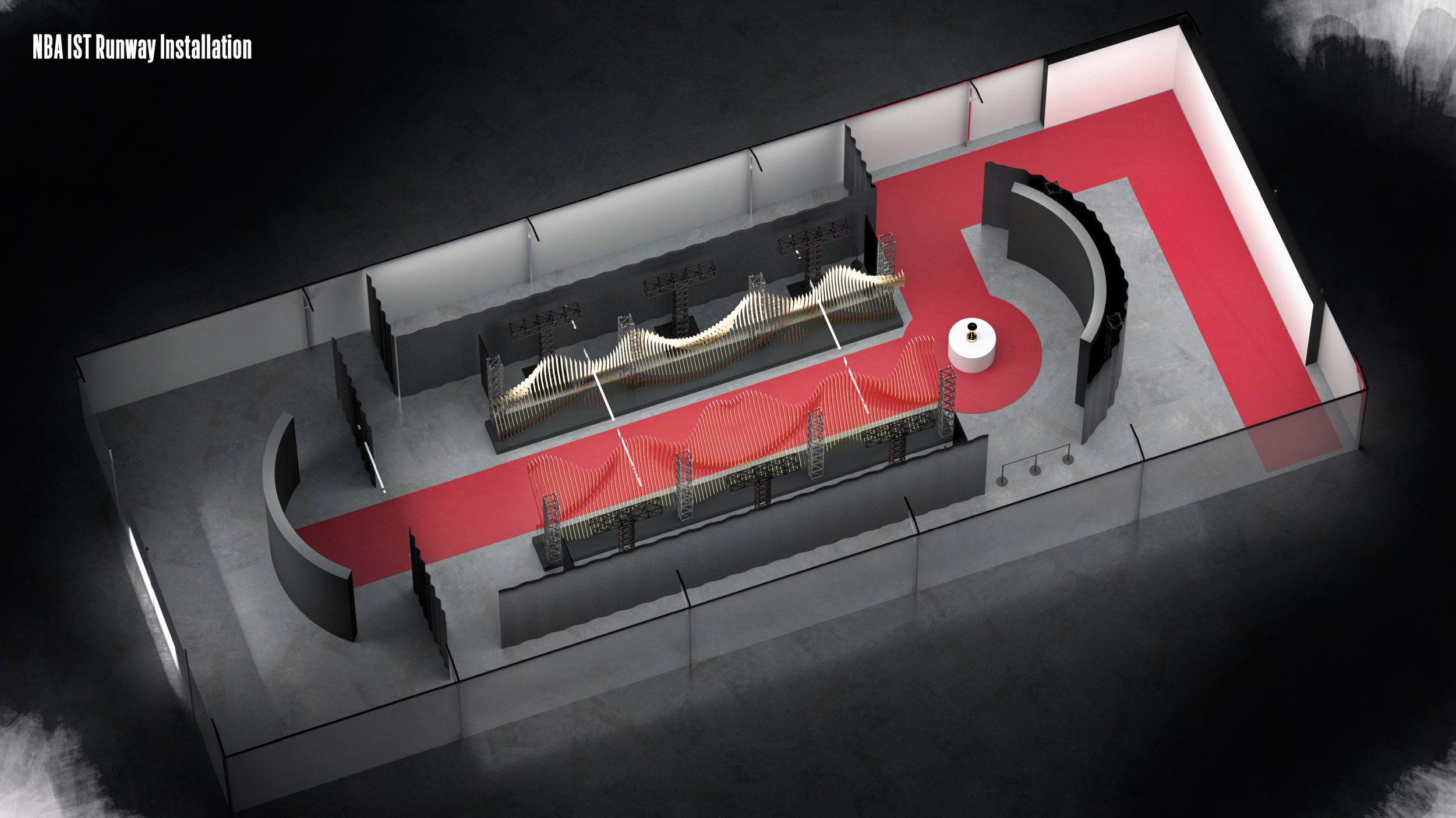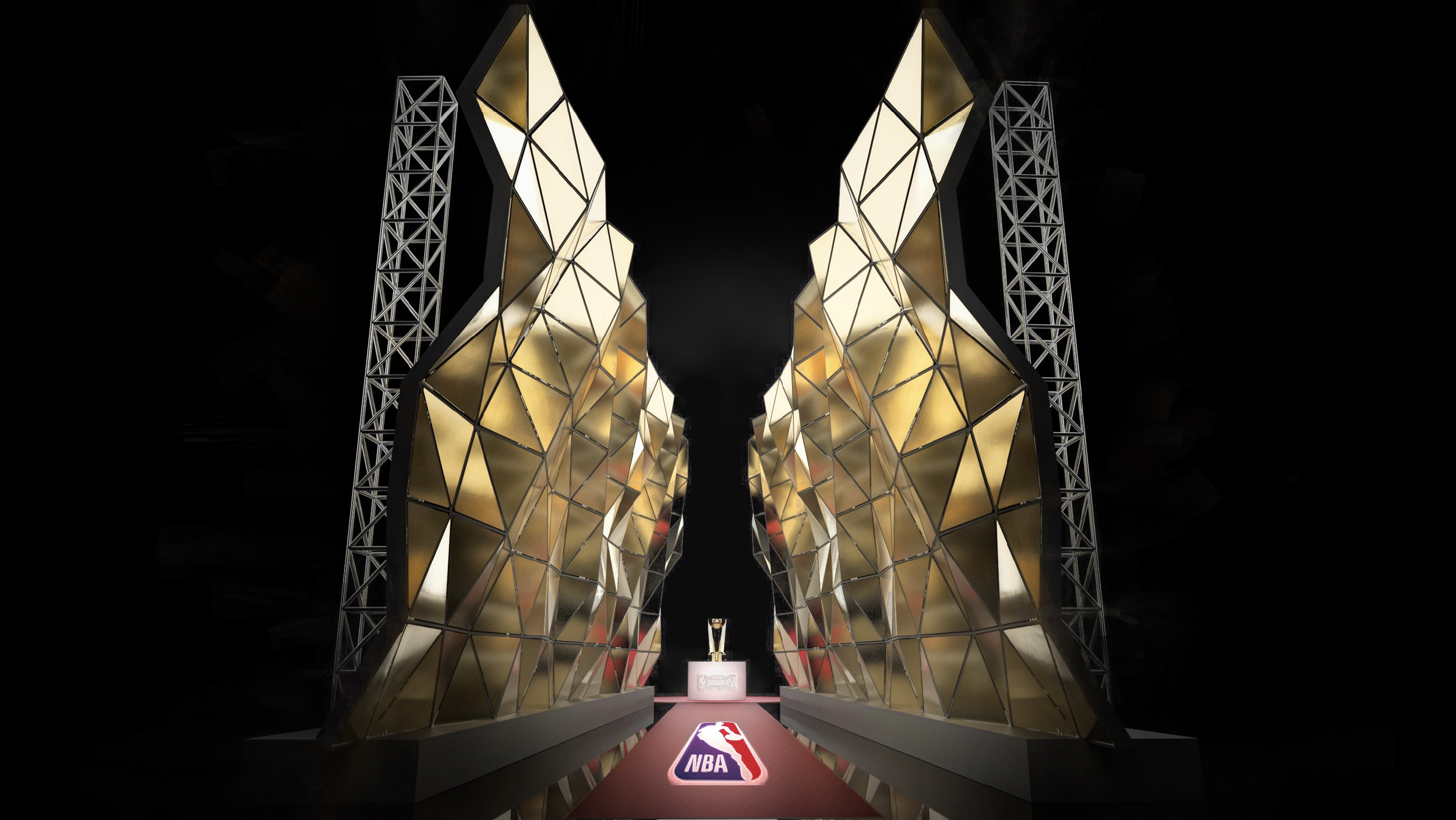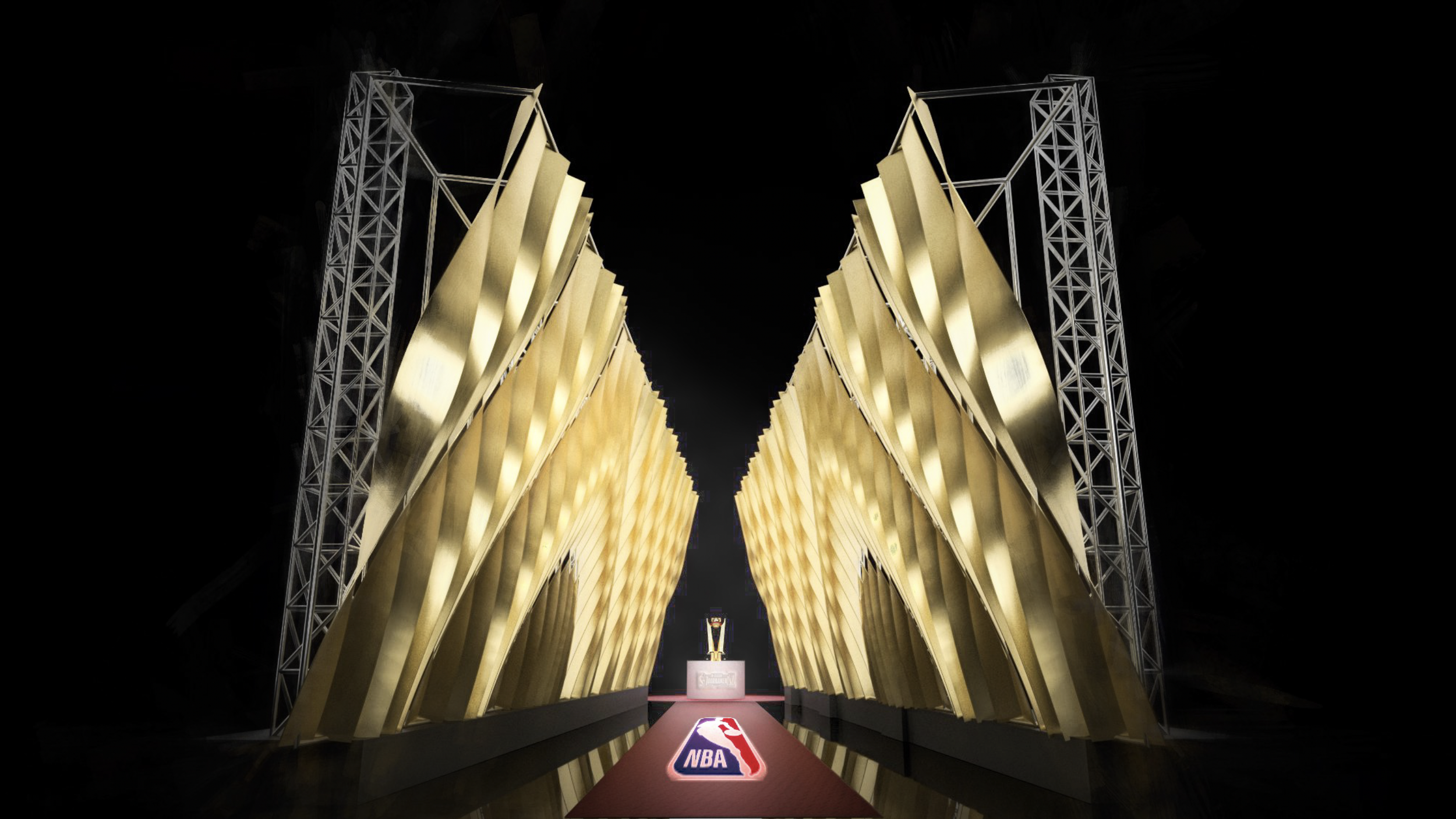 With the NBA’s selection of Approach 1 in hand, we turned it from a cool idea to a buildable structure. No detail too small. Every truss, light, and logo was painstakingly placed, so every paparazzi camera angle would capture a logo and player, and none of the stage dressing.