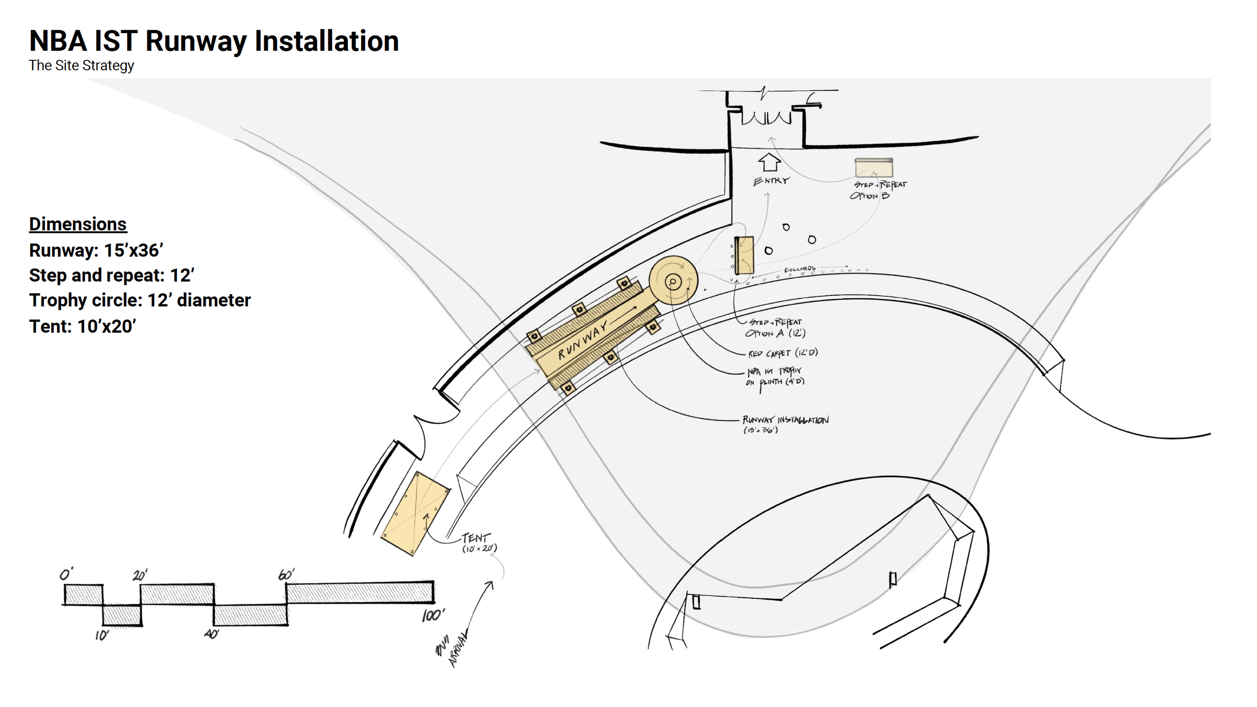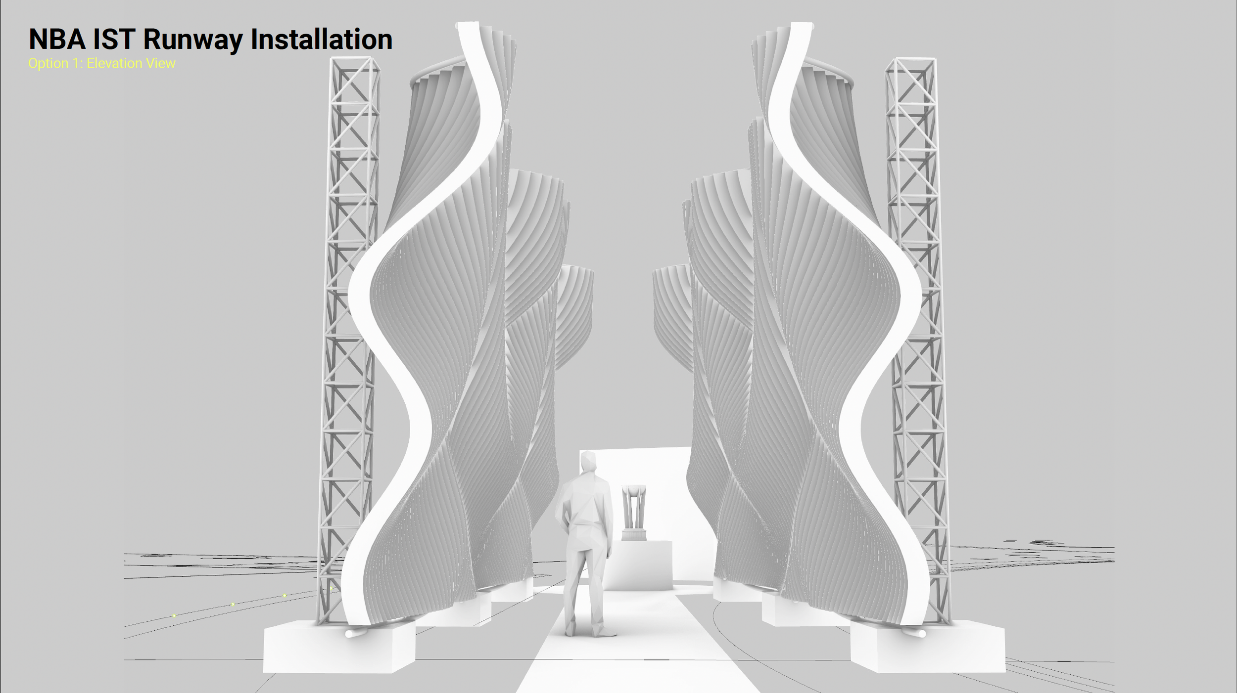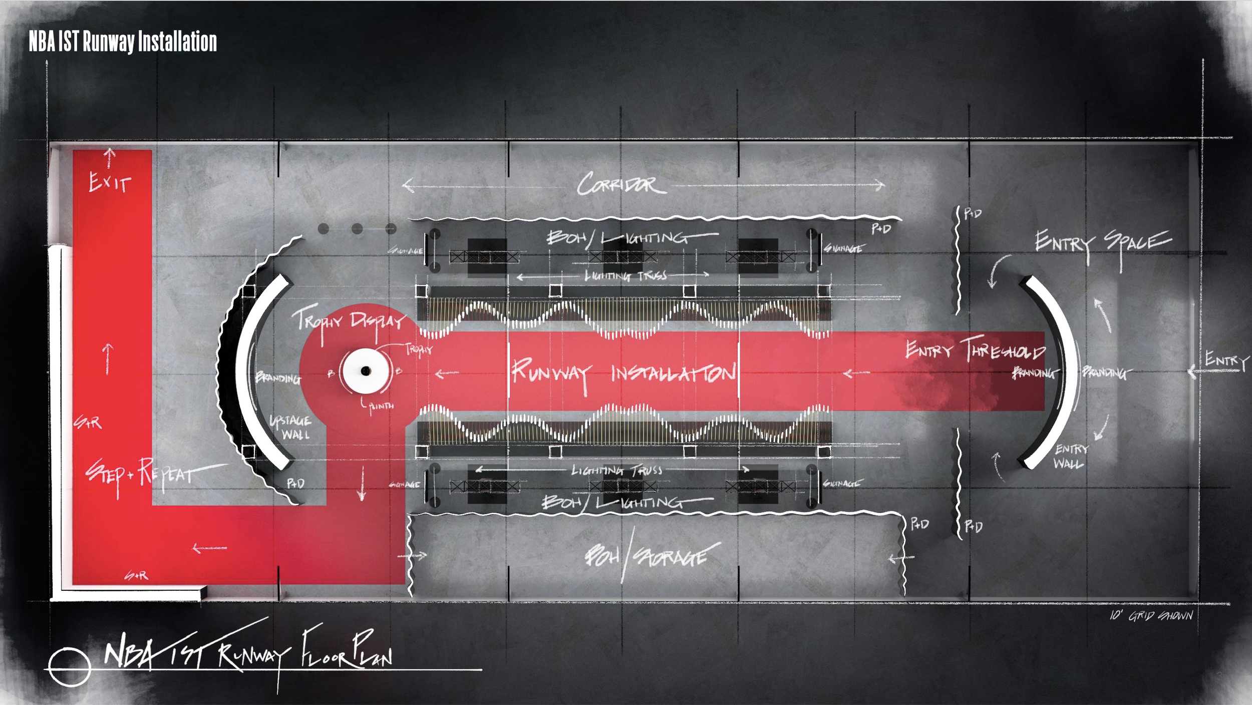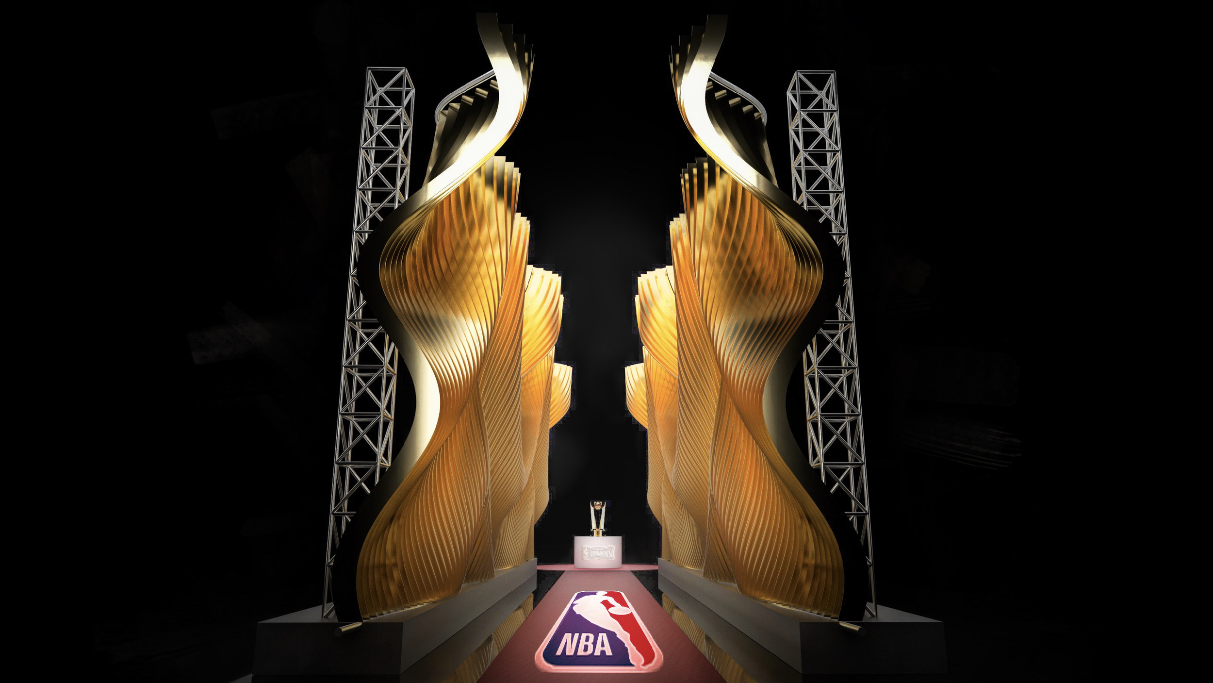 With the NBA’s selection of Approach 1 in hand, we turned it from a cool idea to a buildable structure. No detail too small. Every truss, light, and logo was painstakingly placed, so every paparazzi camera angle would capture a logo and player, and none of the stage dressing.