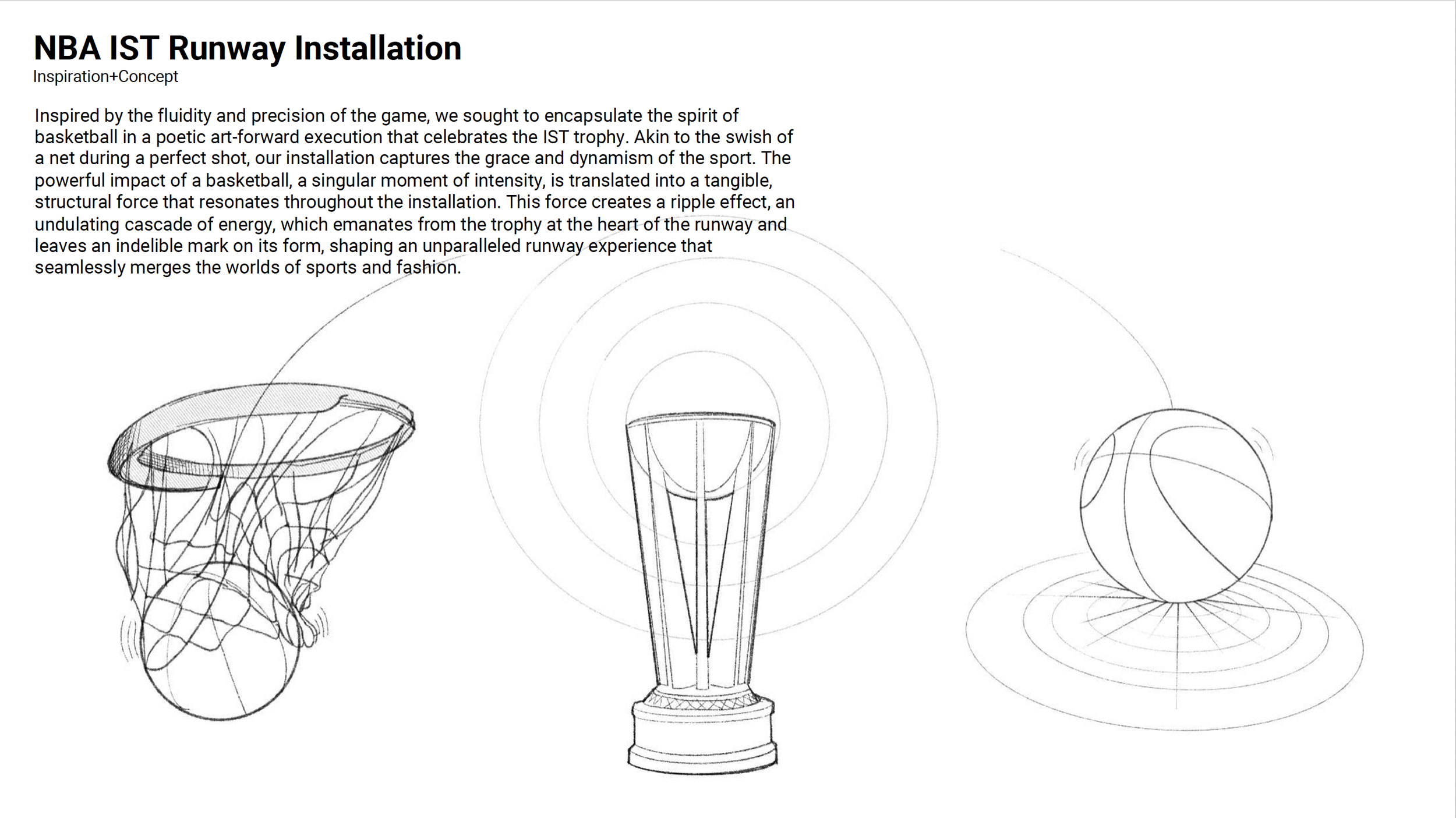 Uniting both the glitzy IST brand and classic basketball nostalgia, we brought the energy and motion of basketball — specifically, a basketball swishing through a net — to life, in runway form.